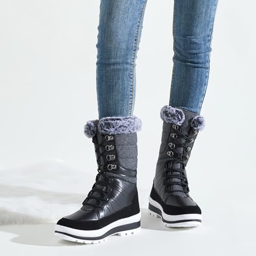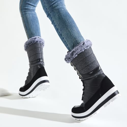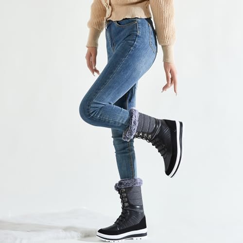 ZGR Women’s Fur Lined Mid Calf Boots,Lace-up Black Boots for women,Water-resistant Winter Snow Boots for outdoor